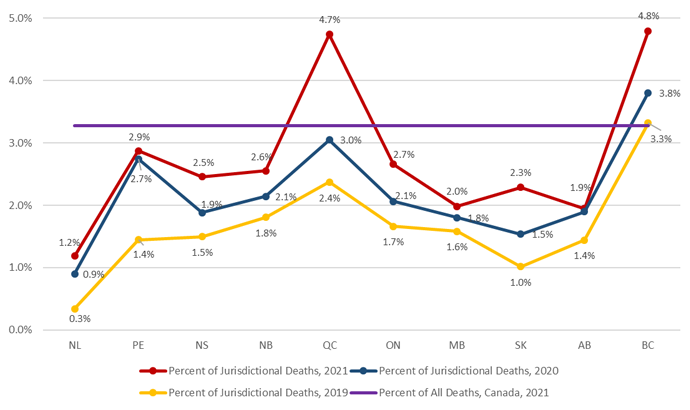 Percentage of Total Deaths Attributed to MAID by Jurisdiction, 2019-2021